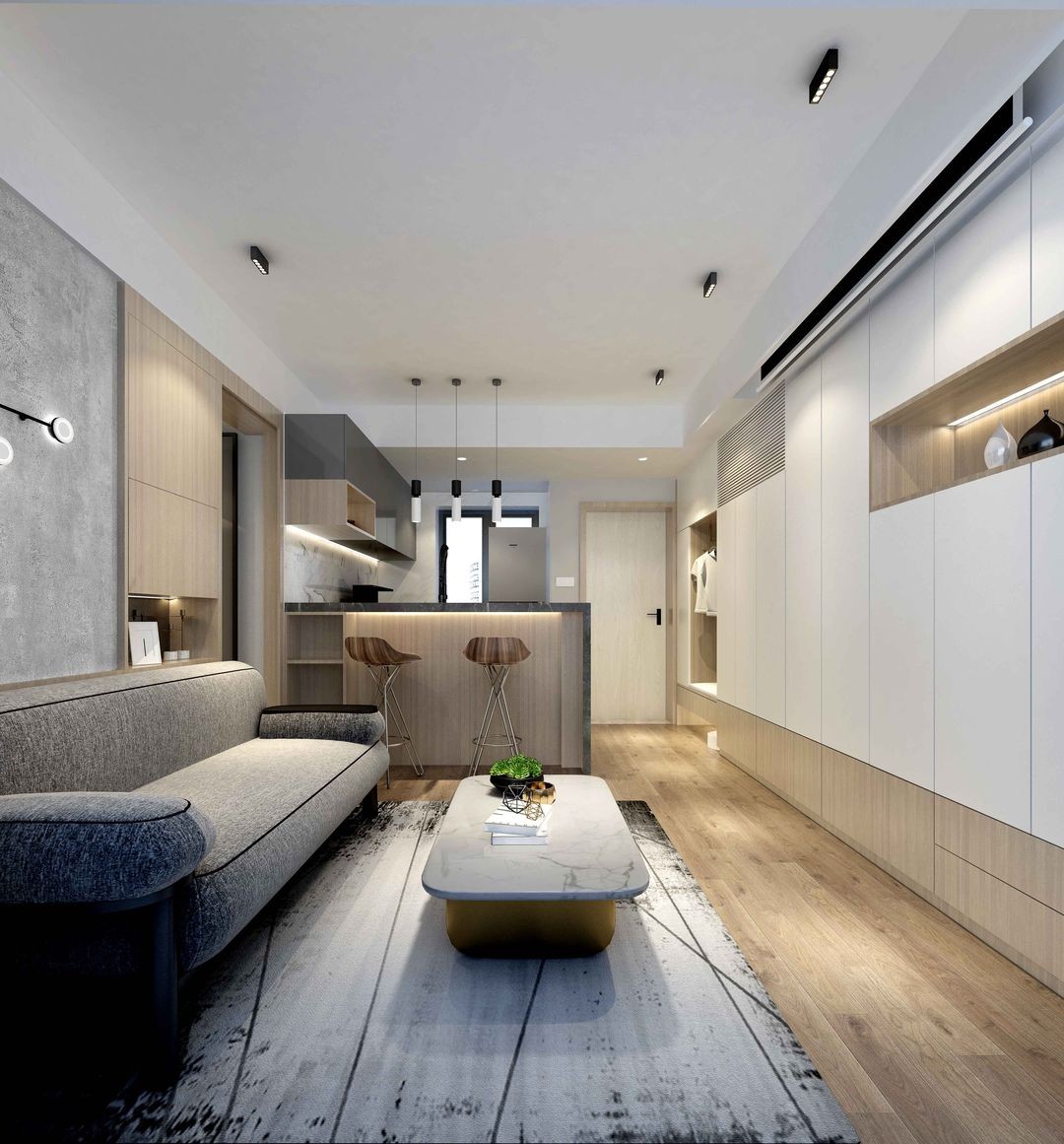 把廚房設計為開放式,吧臺和餐桌結合(很少做飯,平時都是點外賣)。
