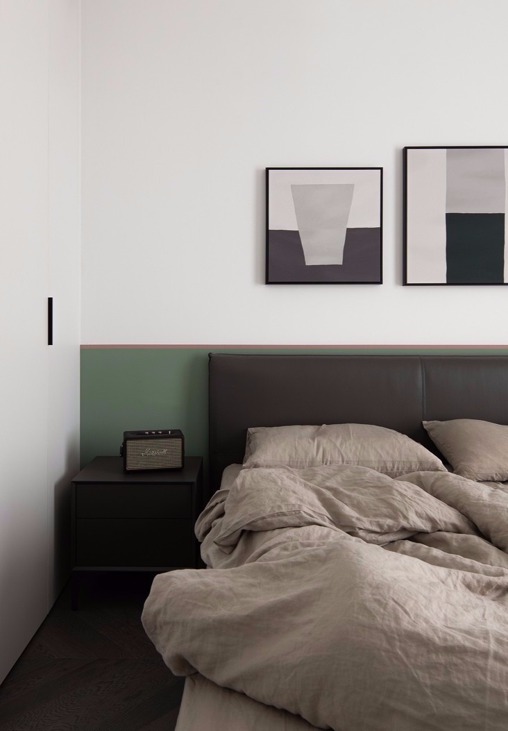 客廳空間以白色為主色調,融入墨綠、酒紅、臟粉等低飽和度彩色,為空間增添了繽紛、動感的視覺效果。