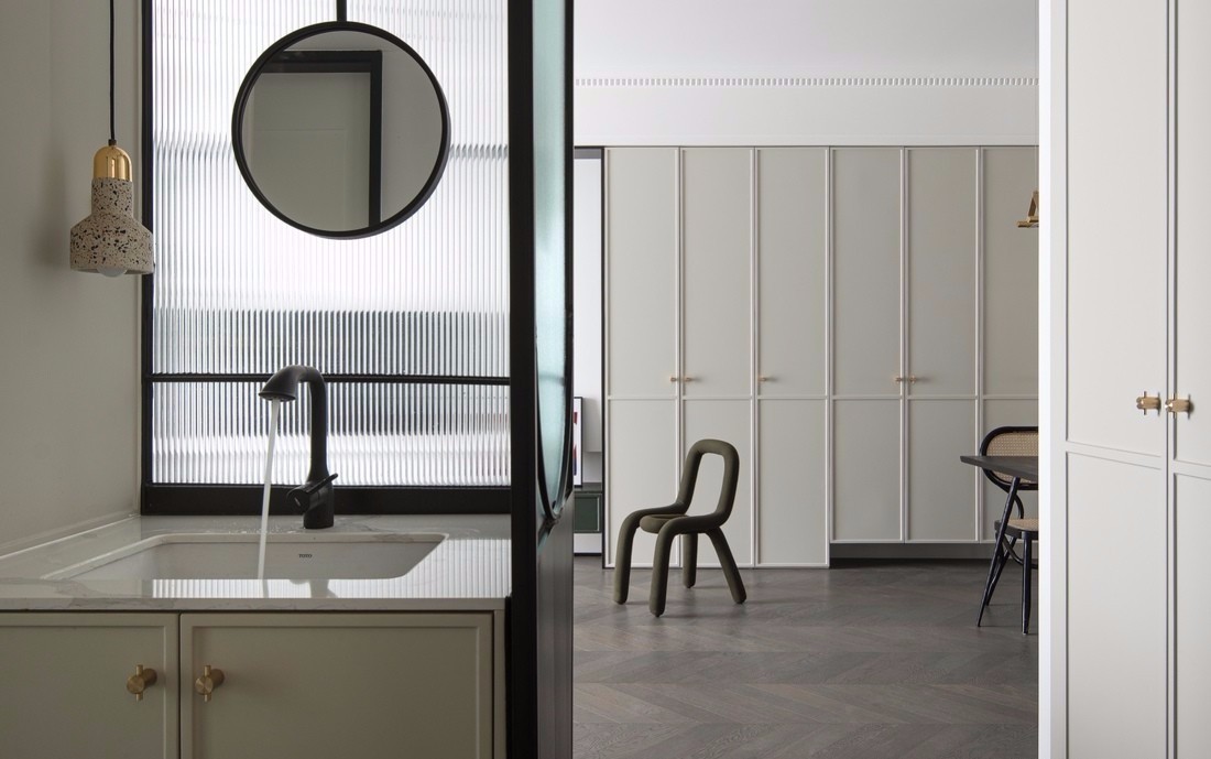 由客廳望向餐廳。客餐廳公共空間以白色為主色調,點綴貫穿全屋的粉和綠。餐邊柜旁的門神,守護陪伴著一家三口,也為這個家注入了更多年輕活潑的元素。