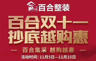 【百】百合雙十一 抄底越購惠 【合】自主工人 品質(zhì)保障 【裝】自營主材 整裝集采 【飾】主材拼單 越購越惠 11 月5日至15日典石廣場期待您的光臨...